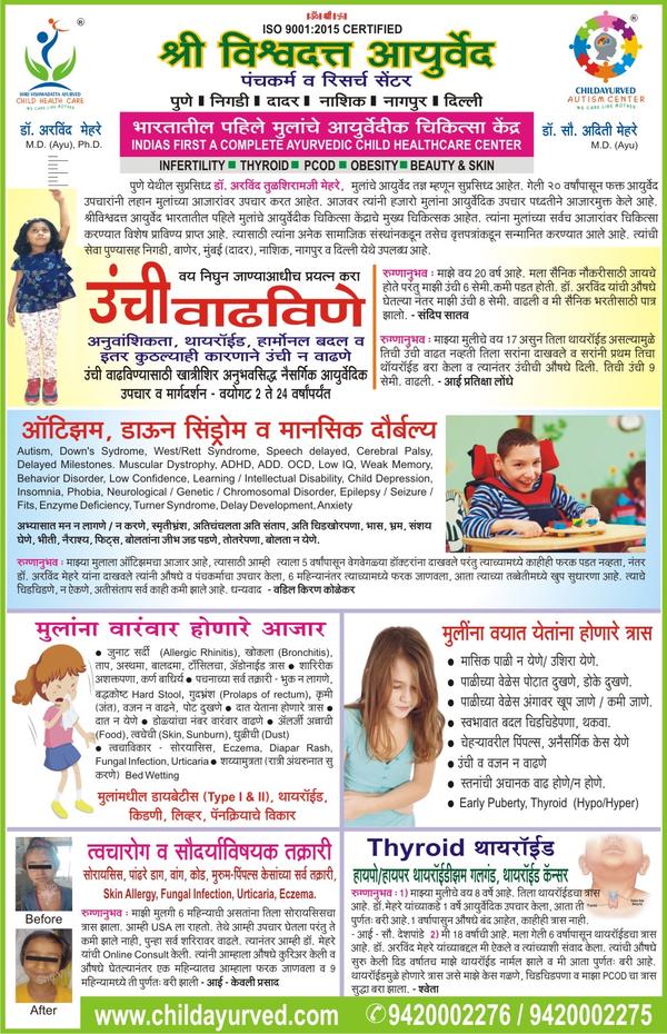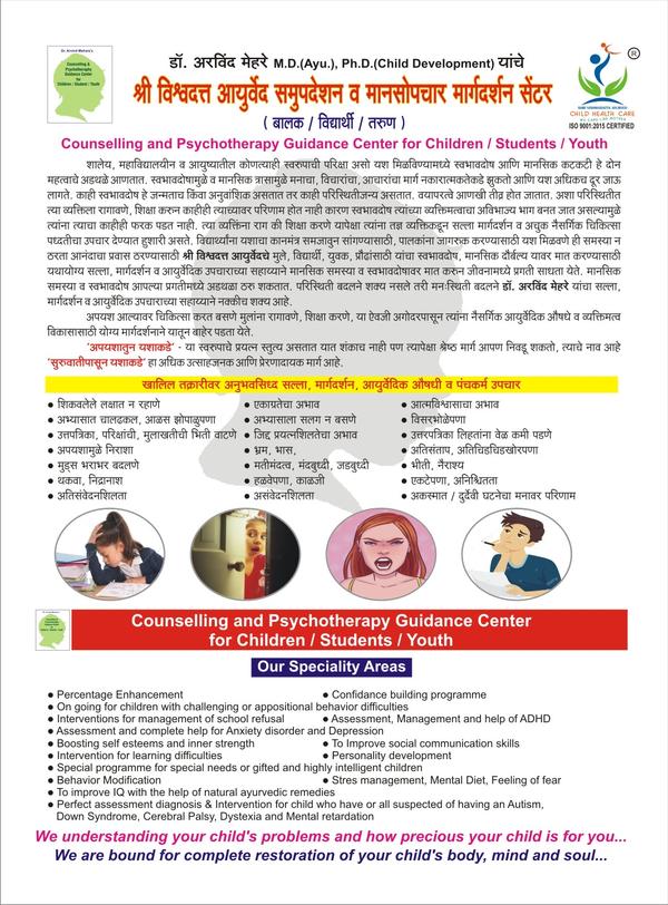 HelloMy child have a problem of Autism with speech delay for this problems we are try to lot of centre of developmental pediatrician and speech therapy OR but in my child problem not solve, after some time we got dr Arvind Mehare child healthcare numbers, we consult to doctor and start his Ayurvedic medicine and he also counselling about parenting; we take him Ayurvedic medicine for autism;after 6 months we got more positive changes in my child;after one-year he can speak and also he do his wor